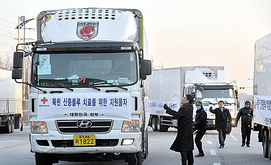 韓國支援團當天上午10點左右同朝方人員會面,利用1小時30分鐘左右的時間將50萬人份甲流感治療藥物轉載在朝方的車輛上。此前,韓國政府從朝韓合作基金中劃撥178億韓元,用于購買治療甲流的藥物。