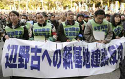 現(xiàn)行計劃中的搬遷地點、沖繩縣名護市新當選的市長稻嶺進也向集會發(fā)來了表達共同愿望的信息。市民團體“直升機基地反對協(xié)議會”的共同代表安次富浩表示:“鳩山由紀夫首相說將把名護市長選舉的結(jié)果作為判斷材料,我們?nèi)〉昧藙倮。沒有比這更能代表民意的了!