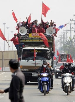 據(jù)報(bào)道,尤其是在曼谷皇家田廣場(chǎng)一帶,到處都可見(jiàn)紅衫軍的車(chē)隊(duì)和旗幟。12日,“反獨(dú)裁民主聯(lián)合陣線”先進(jìn)行熱身,在市內(nèi)6處地點(diǎn)進(jìn)行集會(huì),作為14日大集會(huì)的前奏。