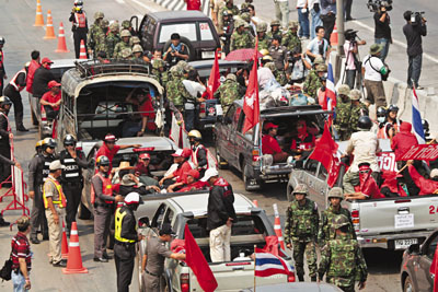 泰國政府原規(guī)定不準(zhǔn)外府紅衫軍駕車入城,以免造成交通堵塞,但紅衫軍拒絕了政府軍警安保人員的要求,軍警為避免和示威者發(fā)生對抗,最后讓紅衫軍一路開車長驅(qū)直入曼谷市區(qū)。