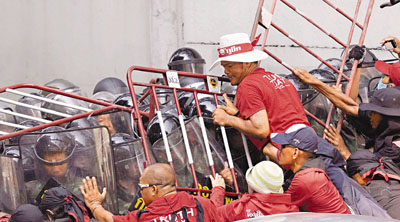 昨日早上9時(shí),約1萬(wàn)名紅衫軍在5星級(jí)酒店四季酒店前面的Rajdamri路集會(huì),警方出動(dòng)5部運(yùn)送囚犯的警車堵塞路面,阻止他們離開曼谷拉差巴頌路的交叉路口,部分紅衫軍企圖沖破約1000名軍警組成的防線,雙方爆發(fā)沖突,互相推撞,示威者又向防暴警察投擲雞蛋和膠瓶,最終成功沖破軍警封鎖直闖“禁區(qū)”。