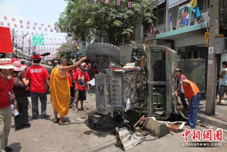 泰國(guó)10日晚的血腥沖突造成至少21人喪生,874人受傷。這是自從1992年有48人在一次反軍方抗議中被殺以來(lái),曼谷最嚴(yán)重的暴力行為。傳媒透露,下令驅(qū)散“紅衫軍”的是陸軍第二把交椅、陸軍副司令帕拉育,他還表示會(huì)承擔(dān)一切后果。暴力沖突后,軍隊(duì)撤后以示節(jié)制,并且要求“紅衫軍”也后退,因此11日深夜,曼谷出現(xiàn)一種非正式的停火狀態(tài)。