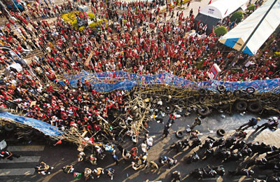 榴彈襲擊翌日,數(shù)百名防暴警察手持盾牌警棍,沒有攜帶槍械,向購物區(qū)的紅衫軍集結(jié)點(diǎn)推進(jìn)。紅衫軍用尖竹和車胎堆成3米高的路障,并灑上汽油,迫使警方退后。紅衫軍后來答應(yīng)警方要求,后退100米,但并未拆除路障。