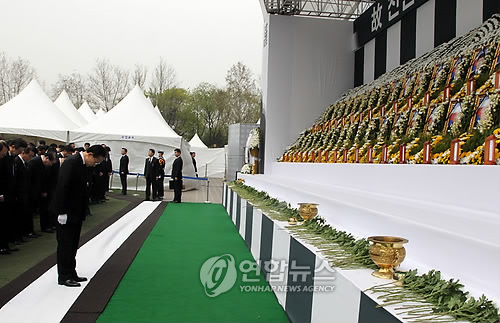 李明博向犧牲官兵獻花燒香后,以悲痛的表情默哀,之后面對一個個犧牲官兵的遺照審視了良久。