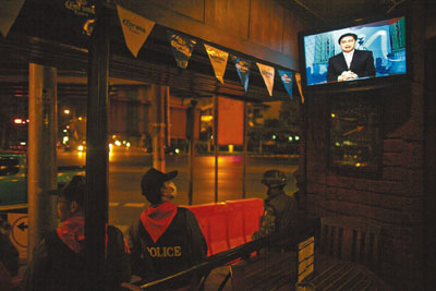 另一方面,阿披實(shí)政府并未放棄驅(qū)離紅衫軍計(jì)劃,解決緊急情勢中心發(fā)言人訕森表示,估計(jì)拉差巴頌路口仍有6000至8000名紅衫軍,當(dāng)局正出動(dòng)裝甲車驅(qū)散駛向該區(qū),執(zhí)行驅(qū)散行動(dòng)。主管安全事務(wù)的副總理素貼表示,參加集會(huì)的示威者應(yīng)該認(rèn)識(shí)到,他們已成為恐怖分子的人肉盾牌,呼吁民眾應(yīng)離開集會(huì)現(xiàn)場,并稱如果他們拒絕,政府將采取強(qiáng)力措施恢復(fù)秩序。