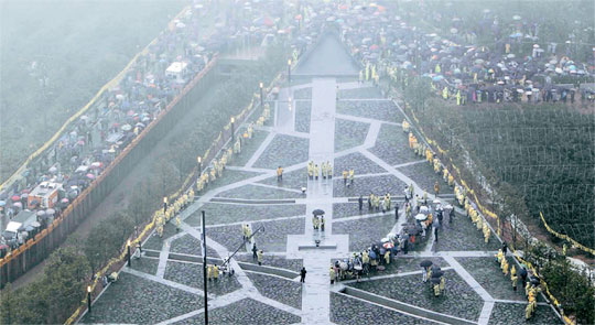 當(dāng)天下午1點(diǎn)30分在墓前面的空地,追悼儀式開始了,F(xiàn)場上映了追悼前總統(tǒng)盧武鉉的短片,追悼儀式現(xiàn)場人潮一度達(dá)到3萬多名。