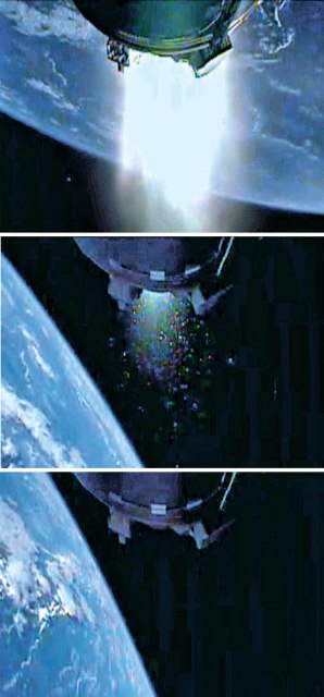 韓國(guó)方面公布的這三張照片,分別是兩段火箭的引擎正常點(diǎn)火發(fā)動(dòng)的照片(上)、兩段火箭的燃素即將熄滅時(shí)的照片(中)和航天器因火箭上段未能正常分離的整流罩而偏離軌道的照片(下)。
