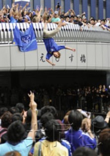 報道稱,大批身著日本隊藍(lán)色隊服的球迷涌上街頭占據(jù)了十字路口,甚至還有球迷跳入河中用這種奇特的方式慶祝勝利。比賽結(jié)束約20分鐘后,第一名球迷跳入河中,隨后又有50余人高呼萬歲跳進(jìn)河里,連早有防備的在場警察也無法勸阻。