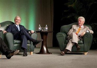 克林頓卸任后,多次與布什的父親、即前總統(tǒng)老布什合作,例如替南亞海嘯及超級(jí)颶風(fēng)“卡特里娜”天災(zāi)的災(zāi)民籌款,兩人有一段時(shí)間經(jīng)常走在一起。布什開(kāi)玩笑道,不知道自己的父親花了多少時(shí)間與克林頓同場(chǎng)亮相。