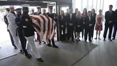 肯尼迪家族發(fā)言人表示,愛德華的遺體27日由寓所運(yùn)到波士頓的約翰-肯尼迪圖書館,需時至少兩個小時,途中經(jīng)過多個對愛德華有重要意義的地方,周五開放給公眾瞻仰,翌日將安葬于阿靈頓國家公墓,毗鄰他的胞兄約翰和羅伯特的墓地。