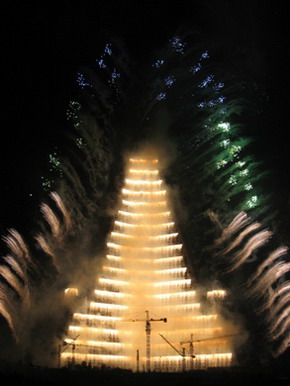 看點(diǎn)二是“強(qiáng)盛大國(guó)的火花”、“我們將勝利”兩場(chǎng)煙火晚會(huì)。4月14日晚,一場(chǎng)旨在紀(jì)念金日成主席誕辰97周年、宣誓邁向強(qiáng)盛國(guó)家的煙火表演照亮了平壤的夜空。隨著聲聲炮響,五顏六色、造型各異的美麗煙火依次騰空,把大同江上下游兩座橋之間的區(qū)域變成了煙火的海洋。朝鮮最高領(lǐng)導(dǎo)人金正日同志的出場(chǎng)令全場(chǎng)氣氛格外高漲,掌聲和歡呼聲回蕩在大同江的兩岸。有意思的是,13日、15日平壤下了兩場(chǎng)春雨,唯獨(dú)14日萬(wàn)里晴好,給煙火表演留下了完美的時(shí)間窗口。5月1日在柳京大廈舉行的焰火晚會(huì)更具特色,巨大的樓體第一次流光溢彩,散發(fā)出美麗的火光,那神奇的景象讓人難忘。