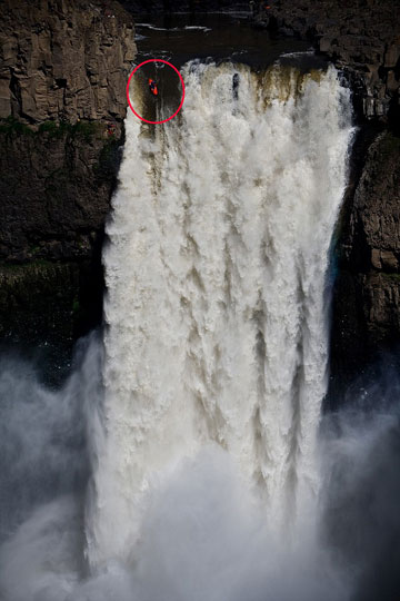 為了為此次降落做準備,來自蒙塔納的布蘭特此前曾經(jīng)嘗試在俄勒岡的瀑布乘著皮劃艇從70-80英尺高的瀑布頂端降落。他最大的創(chuàng)舉是于2007年在加拿大西北領地的亞歷山大瀑布,乘皮劃艇從107英尺高的瀑布降落。