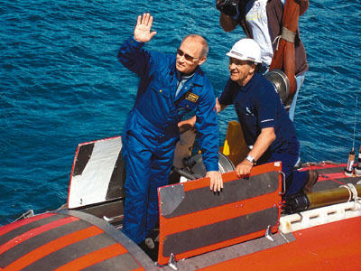 根據(jù)國營電視臺發(fā)出的照片,可見身為柔道黑帶高手的普京身穿藍(lán)色工作服,攀上Mir-1潛艇開始航程。普京在船艙表示:“這次潛水很順利,視野在燈光下很好。”但他對水顯得污濁有微言:“從生態(tài)角度看這些水當(dāng)然干凈,但事實上這是浮游生物湯,起碼我是這樣叫它!