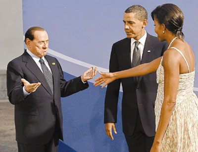據(jù)香港《文匯報》報道,晚宴上,奧巴馬夫婦以東道主身份負(fù)責(zé)迎賓,被意大利媒體稱為“性上癮”的老貝見到美國第一夫人米歇爾時顯得相當(dāng)高興,伸出雙臂示意互相擁抱。誰知米歇爾遠(yuǎn)遠(yuǎn)伸出一只手,示意握手打招呼,令場面顯得很尷尬。更值得注意的是,站在一旁的奧巴馬一臉冷漠,斜睨老貝,顯得十分警惕。