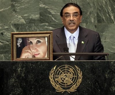 中新網(wǎng)9月27日電 巴基斯坦總統(tǒng)扎爾達(dá)里在聯(lián)合國(guó)大會(huì)上演講時(shí),把他的已故夫人貝-布托和岳父布托的照片擺上演講臺(tái),并吁請(qǐng)世界各國(guó)為巴國(guó)打擊恐怖主義和宗教極端主義提供更多協(xié)助。