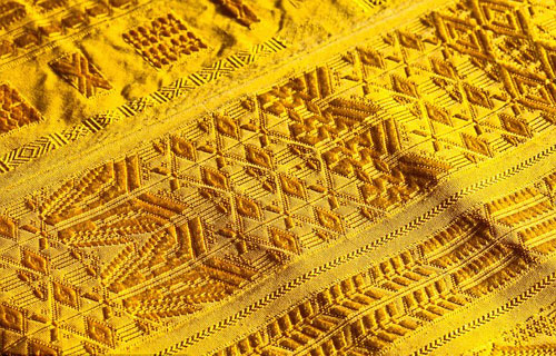 圍巾用了100萬只來自馬達加斯加的雌性蜘蛛,它們吐出的絲出名金黃及堅韌。這些蜘蛛無毒,工人小心地將它們分開擺放,以防它們吃了對方或逃走?棽脊と巳缓蟪槌鰭煸谥┲胪陆z器的細絲,而每只蜘蛛可以吐出達400碼(約365米)的金線。每個器具的24條細絲接著會以手搓成一條線,然后結(jié)合另外3條這樣的線再搓,便可以用來編織。