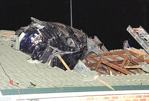 19日凌晨,尚在睡夢中的阿諾德夫婦突然被一聲巨響驚醒,他們感到自己家的平房似乎在震動,于是立即抱著僅有3個月大的女兒沖出了室外。他們被眼前的一幕驚呆了:一輛汽車砸爛了他們家的屋頂,而且一半車身已經(jīng)陷了進去。如果汽車掉進他們家臥室的話,后果將不堪設(shè)想。