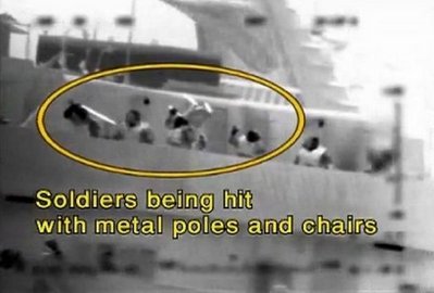 以軍發(fā)布長1分鐘的紅外線錄影片段,并配上英文字幕上載至YouTube網(wǎng)站。片段可見,當(dāng)首名士兵從直升機(jī)游繩而下,甫踏足土耳其救援船“馬維.馬爾馬拉號(hào)”甲板之際,一名船員便向他投擲閃光彈,甲板上的人紛找掩護(hù)或伏在地上。這時(shí)候,有船員抓住以軍的繩子搖晃,一名士兵似脫手掉下。他們又把繩子縛在甲板,企圖扯下直升機(jī)。降落甲板計(jì)程車兵遭佩戴防毒面具的船員攻擊。字幕稱:“士兵遭人以金屬棒和椅子毆打!贝瑔T又企圖搶奪士兵的武器,一名士兵更被多名船員合力抓住雙腿,從甲板拋下!