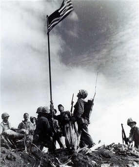 美軍勝利后于1945年2月23日在島上的折缽山上豎立了美國國旗。雅各布斯一直堅持說他就是首次豎立國旗的照片上那個背著無線電報話機(jī)的通訊員。這張照片是Leatherneck雜志的攝影師拍攝的。