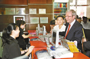 陸克文總理在北京王府井書店收款臺(tái)交款。 北發(fā) 攝