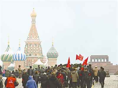1月21日,在俄羅斯首都莫斯科,數(shù)百名俄共黨員及普通民眾排隊向紅場邊的列寧墓獻(xiàn)花圈。當(dāng)日,數(shù)百名俄共黨員及普通民眾舉行活動,紀(jì)念列寧逝世85周年。