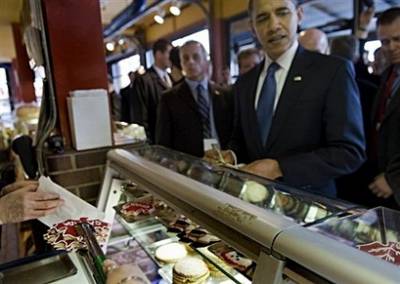 奧巴馬忙里偷閑,東看西看,他買了一條鑰匙鏈,還四處尋找有沒有中意的水晶球,不過,他逛市場最主要的目的,是要替兩個女兒買餅干,他替女兒選了一些楓葉造型的點心,店家不愿意收他的錢,一行人逛完準備離開的時候,一名婦人捧著渥太華一種名叫“海貍尾巴”的特色點心,請奧巴馬品嘗。