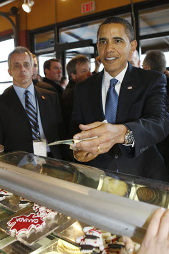 該店員工杰西卡•米連是一位奧巴馬超級粉絲,幸運地被選中為美國總統(tǒng)服務(wù)。她選擇了肉桂糖粉口味,并用楓糖漿和巧克力醬寫上了字母“O”,以代表奧巴馬。“這絕對是我生命中最激動人心的時刻。”米連在接受采訪時說,“我們還聊天了。他是個非常和藹可親的人,我甚至不覺得自己在和美國總統(tǒng)說話!