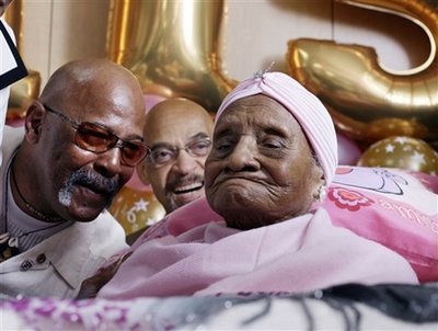由于居住在葡萄牙的女人瑞在去年過世,貝恩斯由今年1月成為全球最老的人瑞,經(jīng)過吉尼斯世界紀(jì)錄委員會(huì)的認(rèn)證。她在美國大選中投下奧巴馬一票,成為最年長黑人選民,見證歷史,全國知名。但她現(xiàn)在住在醫(yī)院里,平常還喝一點(diǎn)酒。