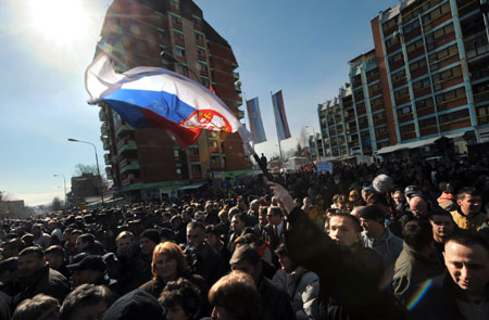 19日中午,幾千名塞族學生在大橋北岸游行,塞爾維亞國旗迎風飄舞。游行是在12點44分開始的,寓意是聯(lián)合國安理會第1244號決議。該決議重申南聯(lián)盟(主權(quán)地位后為塞爾維亞繼承)對科索沃地區(qū)擁有主權(quán)。