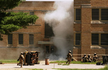 最具真實感和危險性的體驗場景,是清除一座建筑內(nèi)的潛在威脅。海軍陸戰(zhàn)隊員越過前院燃火的鐵絲網(wǎng),冒著手榴彈爆炸的巨大聲響,進入建筑展開全方位地毯式搜查行動,直至確定消除所有具有攻擊能力的敵人,救出全部幸存者。
