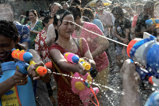 在幾天前紛紛暫停營業(yè)的曼谷暹羅廣場商業(yè)區(qū),唐人街的金店重新開門迎客。游客們又有了花錢的去處。15日晚上,在熱鬧的是隆路和考訕路,外國游客和泰國人無憂無慮地互相潑水、打水槍。