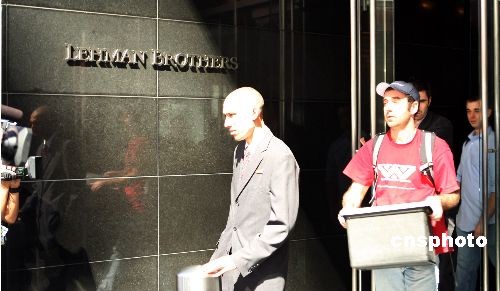 9月15日,美國有著158年歷史的第4大投資銀行雷曼兄弟公司于向法院申請(qǐng)破產(chǎn)保護(hù),員工當(dāng)日從雷曼兄弟公司位于紐約的總部大樓內(nèi)將清理的辦公用品搬離公司。中新社發(fā) 鄧悅 攝