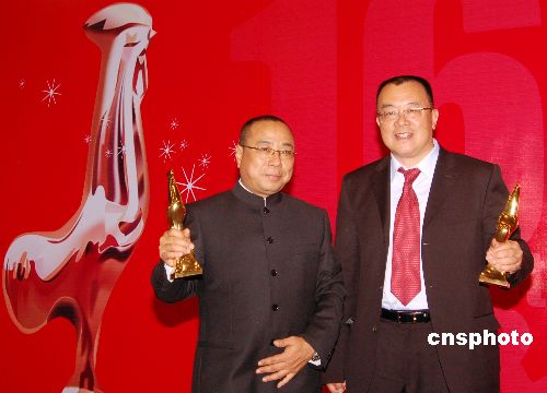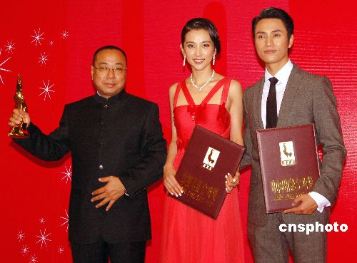 ,《云水瑤》以八項(xiàng)提名成為大熱門(mén),最終繼獲“華表獎(jiǎng)”之后再獲金雞獎(jiǎng)最佳影片獎(jiǎng)。圖為導(dǎo)演尹力與主演李冰冰、陳坤登臺(tái)領(lǐng)獎(jiǎng)。