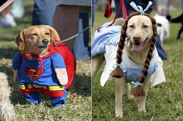 圖片十二:在美國加州長灘舉行的萬圣節(jié)服裝游行上,一種短腿長身的德國種獵犬芭比裝扮成超人的模樣;右圖中這個小狗的造型你熟悉么?它是來自新奧爾良的洛克西,它扮演的就是《綠野仙蹤》中的小女孩多羅茜。(鐘巖)