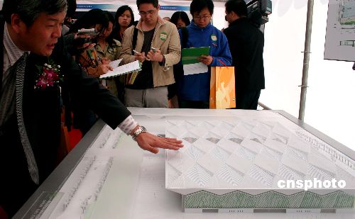 世博集團董事長戴柳(左)在首次亮相的“世博會主題館模型”前介紹說,這一展館的建設(shè)成本將控制在十三億人民幣左右。