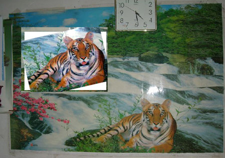 前晚9時(shí),網(wǎng)友“攀枝花xydz”在“打虎派”大本營(yíng)色影無(wú)忌華南虎臨時(shí)論壇發(fā)帖說(shuō),“周老虎”的原形是一副老虎年畫(huà),除耳朵不一樣外,哪里都一樣,甚至連老虎紋路都是一樣。各路高手將年畫(huà)老虎與“周老虎”進(jìn)行比對(duì),得出是同一只老虎的結(jié)論。