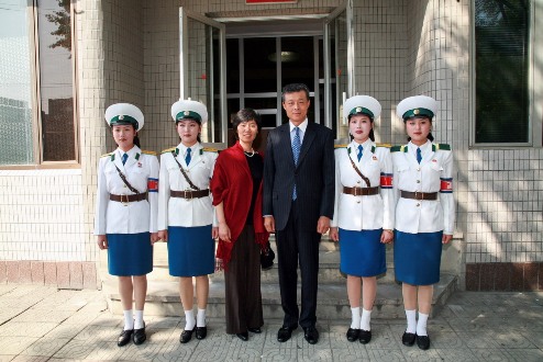 中國(guó)駐朝鮮大使劉曉明與夫人和女交警合影留念。(中國(guó)駐朝鮮使館網(wǎng)站圖)