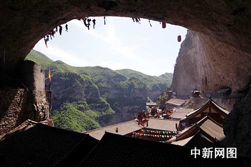 抱腹巖為綿山百余處巖洞之首,因形如兩手抱腹,所以又叫抱腹巖。抱腹巖之腹大,大得驚人:抱二百余間殿宇禪房及一兩萬名游人于腹內(nèi)而不顯得擁擠。抗戰(zhàn)時期,介休抗日民主政府常在這里召開全縣軍民大會,部署生產(chǎn)和戰(zhàn)斗任務(wù)。抱腹巖是天然生成的超大型禮堂.抱腹巖坐東面西,為一高約18丈,長約45丈,深約15丈的巨形巖洞。巖洞分上下兩層,上層是兩個直角排列的大巖洞,很象磚圈的“無量殿”,路斷處有木棧道溝通,自下仰望殿宇參差,勾欄蜿蜒,猶如空中樓閣.更引人注目的是巖洞頂壁的無數(shù)個鳥洞和懸掛著的銅鈴。抱腹巖掛鈴為綿山一絕,每逢廟會,許了愿的善男信女們便雇人從巖頂將掛鈴者用繩子吊在半空,然后利用前后晃動的力量將人悠進洞內(nèi),用鐵鉤鉤住頂壁打楔系鈴。操作完畢后再用繩子把掛鈴者放到巖下。場面驚心動魄,令人嘆為觀止。清代康熙年間介休文人王清在《抱腹巖》一詩中寫道:“寺古云常在,巖空勢欲傾。此中真得地,以外縱浮名。鳥拂金鈴渡,僧緣石隙行。坐聽梵響處,花雨落無聲”,可謂繪聲繪色的抱腹巖寫照.其中“鳥拂金鈴渡,僧緣石隙行”更成為人們廣泛傳頌的名句。很久以前,綿山中生活著一種叫吻的野獸,非常兇猛,常常傷害過往行人.附近的村民靠山吃山,以采藥為生,而野獸封山,村民們無不頭痛萬分/于是推薦了一個身體強健,狩獵本領(lǐng)很強的年輕人前去降吻。這個年輕人想只憑自己的力量那太微不足道了,如果能得到神靈的保佑,一定會萬無一失。于是他就去求空王佛保佑,祈求老人家賜給自己一件法寶,以降服吻獸.年輕人祈禱完畢,正要走時,忽然看見供案上金光閃閃,霎時滿殿生輝。走近一看,原來是只銅鈴,銅鈴上還有一道經(jīng)文。這時殿內(nèi)突然有個縹緲的聲音:“念此咒,便可降住怪獸,快快去吧.”年輕人這才恍然大悟,慌忙叩拜點化之恩.后來果然降服了吻,人們?yōu)榱烁兄x空王佛的慈悲之心,就把這個銅鈴掛在抱腹巖的巖頂上,讓它為人們消災免禍.