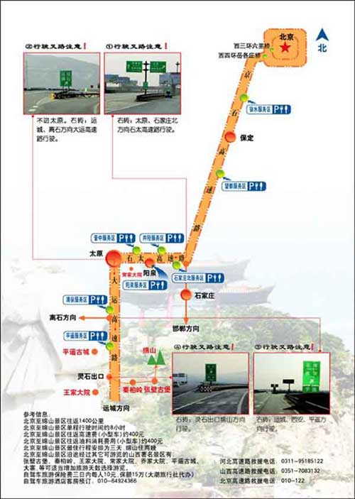 綿山風景區(qū)和世界文化遺產(chǎn)——平遙古城;大紅燈籠高高掛——喬家大院;中國民間故宮,華夏第一民居——王家大院,華夏第一柏——秦柏嶺景區(qū)等,近在咫尺,任您組合,名山,名城,名院,名樹一游皆得。山西省境內(nèi)大運高速公路,貫穿南北,從北京至綿山全程高速公路680公里(京石高速—石太高速—大運高速—靈石或介休下高速)僅需7個小時車程。在北京西站乘N203次或2519次空調(diào)專列到介休。