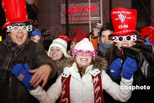 2008年來臨的第一刻,人們聚集在紐約時代廣場慶祝新年來臨。
