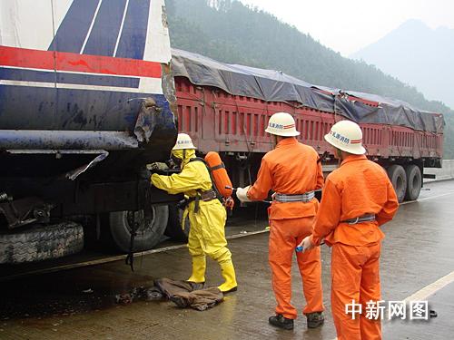 交警在南行東坪和梅花出口和北行乳源出口實施車輛分流制,并在南行云巖坡頂實施臨時禁行交通管制。消防官兵則兵分兩路,一組人員著防化服佩戴空氣呼吸器對危險品運輸車實施堵漏,另一組對追尾貨車內(nèi)被困人員進行救援。經(jīng)過消防官兵近一個小時的奮力營救,于10時55分將被困人員救出,并及時送往醫(yī)院救治。