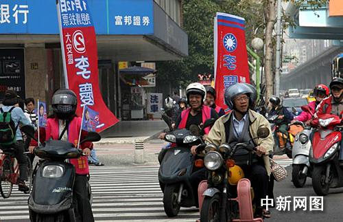 一月十日,一名“立委”候選人的選務(wù)團(tuán)隊,將拉票彩旗插在摩托車上穿梭于臺北街頭造勢。 作者:孫自法