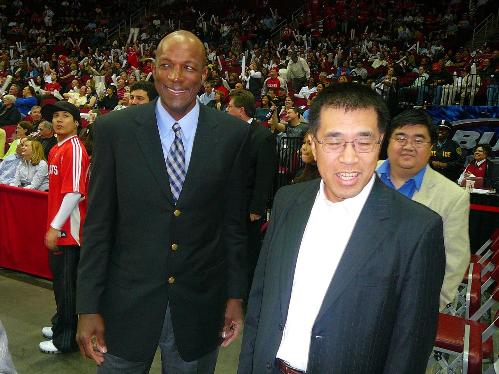 火箭隊(duì)“滑翔機(jī)”得雷克斯勒(右)見(jiàn)到老朋友王寧后特別高興。美國(guó)《明橋體育》供圖 / 許陽(yáng) 言心 攝影