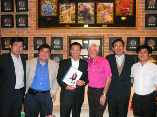 王寧部長(zhǎng)(左3)在《明橋體育》負(fù)責(zé)人和當(dāng)?shù)刂A人企業(yè)家郭翔的陪同下,拜訪六十年代國(guó)際著名的高爾夫球星道格-桑德斯(右3),并邀請(qǐng)他到中國(guó)去訪問(wèn)。美國(guó)《明橋體育》供圖 / 許陽(yáng) 言心 攝影