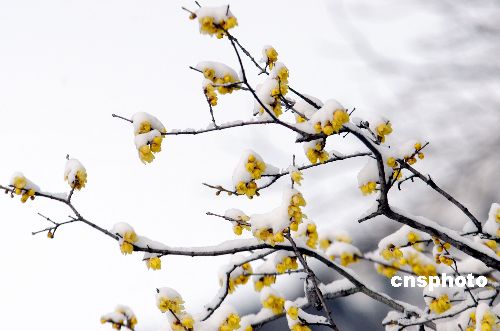 1月19日,安徽淮北相山公園內(nèi)數(shù)株盛開(kāi)的臘梅,在冰雪映襯下十分嬌艷。中新社發(fā) 泰峰 攝