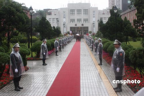 數(shù)十位腳登高筒皮靴的警官冒雨列隊(duì)在“立法院”紅地毯兩側(cè),迎接前來報(bào)到宣誓就職的臺(tái)灣第七屆“立法委員”。