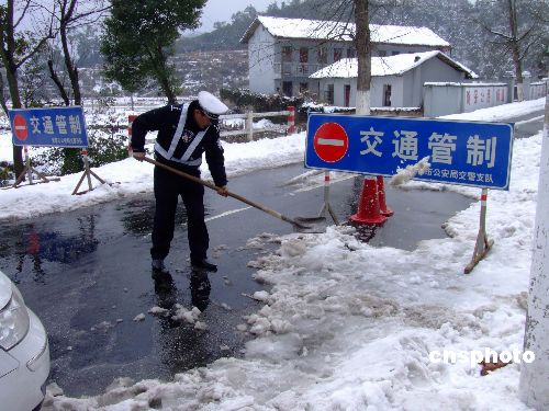 1月中旬以來(lái),江西宜春遭遇幾十年一遇的冰雪災(zāi)害天氣。2月3日上午,江西宜溫公路被迫關(guān)閉,宜春交警冒著嚴(yán)寒疏導(dǎo)交通,11點(diǎn)30分實(shí)現(xiàn)單線行車。中新社發(fā) 彭小榕 攝