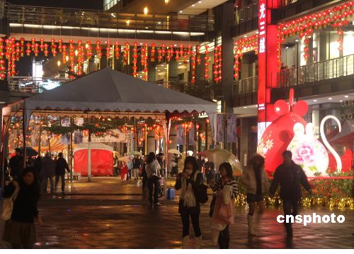 為營(yíng)造春節(jié)的歡慶氣氛,臺(tái)灣許多商業(yè)區(qū)都做了精心的裝飾。圖為臺(tái)北新光三越的廣場(chǎng)前中國(guó)傳統(tǒng)的大紅燈籠高高掛。