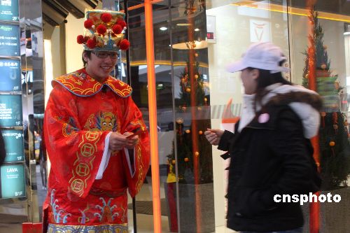 中國(guó)春節(jié)假期,臺(tái)北市許多店家想辦法招攬顧客。圖為信義商圈的一家電器店員身著古裝向顧客派發(fā)紅包。