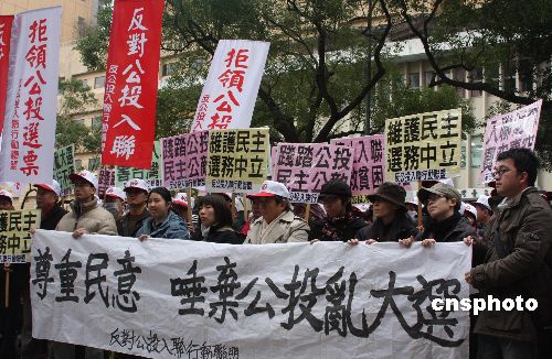 臺(tái)灣“中央選舉委員會(huì)”將從2月27日起主辦十場“入聯(lián)公投”、“返聯(lián)公投”意見發(fā)表會(huì)或辯論會(huì),14日是反方代表申請(qǐng)期限。臺(tái)灣勞動(dòng)黨主席吳榮元、民主行動(dòng)聯(lián)盟總召集人黃光國到“中選會(huì)”遞交公投反方代表申請(qǐng)書,他們還率領(lǐng)“反公投入聯(lián)行動(dòng)聯(lián)盟”成員在“中選會(huì)”前表達(dá)訴求,群眾高舉“反對(duì)公投入聯(lián),拒領(lǐng)公投票”等標(biāo)語,主張拒領(lǐng)公投票,要求中國國民黨與民主進(jìn)步黨拋棄“公投入聯(lián)”、“公投返聯(lián)”議題。中新社發(fā) 耿軍 攝